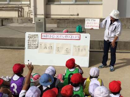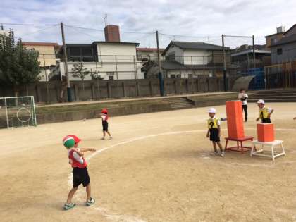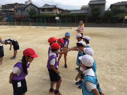 体育の学習でボールなげゲームをしています。ゲームの規則を守って懸命にシュートしました。チームで協力することやマナーの大切さを学んでいます。