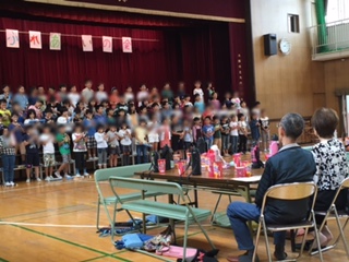 4年生がお礼の気持ちをこめて、合唱奏しました。そして、手作り作品をプレゼントしました。