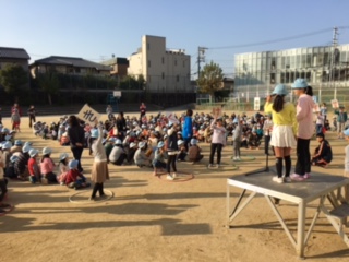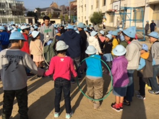 今日の児童集会は、スマイル班対抗フラフープくぐりリレーでした。1年生から6年生までチームワークよくフラフープをくぐりました。その後、身体の曲げ伸ばしに気をつけながら姿勢体操をしっかり行いました。
