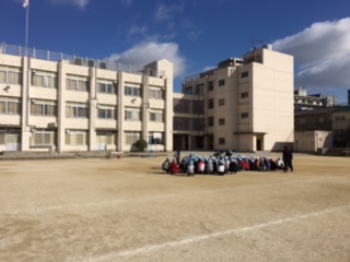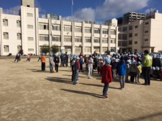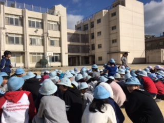 地震を想定した避難訓練を行いました。今回は、休み時間中に地震がおきたということで、それぞれの場所で危険に備えた行動をしなければなりません。運動場で遊んでいた子どもたちは中央に集まって次の指示を待つことができました。