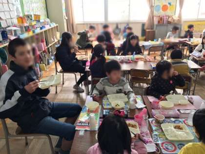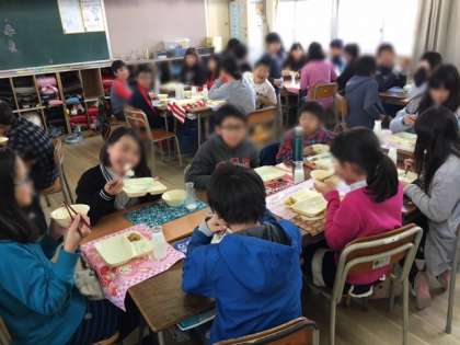 6年生とお別れ交流給食をしました。どの学年もお世話になった6年生たちとの会食は、心に残るものになりました。