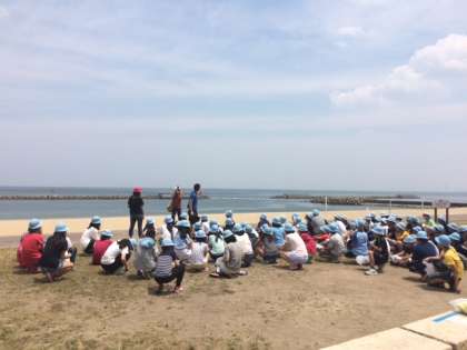 磯遊びの後は、海を眺めながらお弁当を食べています。