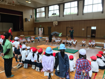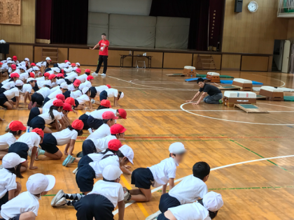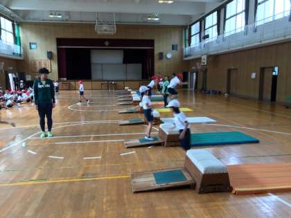今日は、2年生の夢授業で体操競技の元オリンピック選手である藤田健一さんを講師に招き、マット運動や跳び箱運動を教わりました。また、素晴らしい技の数々も見せていただきました。