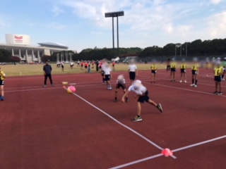午前の部は、サッカー、ドッジボール、長縄をしました。午後からは、ヤンマースタジアムに移動しトラック競技をします。