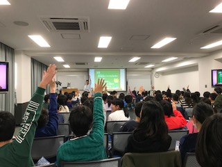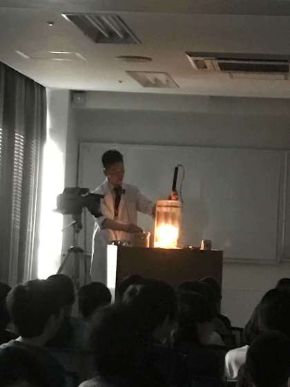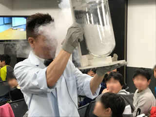 5年生は、校外学習で大阪科学技術館に来ています。実験コーナーで、極低温の世界について教えてもらいました。