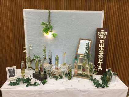 写真は、本年度のPTA社会見学で作成したハーバリウムの展示です。来場者の方々からもとても好評でした。