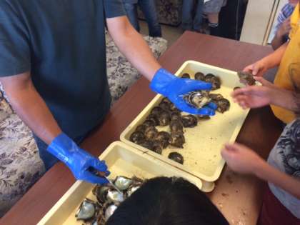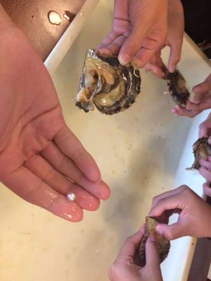 お店の方に説明を受けたあと、一人ひとり、あこや貝から真珠を取り出しました。「あったあった!」と歓声をあげながら、みんな嬉しそうに取り組みました。