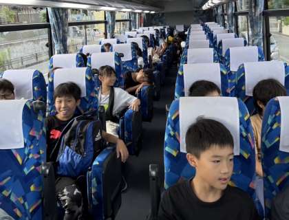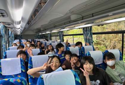 道の駅能勢でトイレ休憩をしました。9時20分過ぎに道の駅能勢を出発しました。バスの中では楽しくお話をしたり、キャンプファイヤーで歌う曲を聴いたりして過ごしています。予定通り9時45分にるり溪少年自然の家に到着します。
