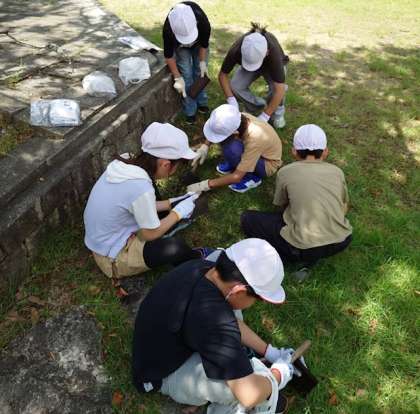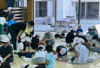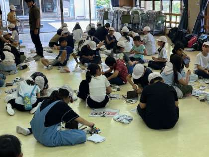 焼き板をしています。外に出てブラシで板を磨き、その後プレイルームで組ひもをつけました。ポスカで文字を絵を描いて仕上げます。