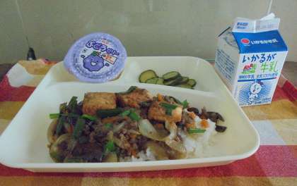 2学期最初の給食です。献立は、マーボーあつあげ丼、きゅうりの中華あえ、ぶどうゼリー、ご飯、牛乳です。