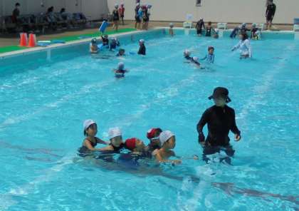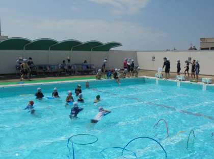 1年生が水遊びをしました。来週でプール学習は終わりです。今日は、水中サーキットをしました。シャワーを浴びながら歌う、宝さがし、桶に入れた水を頭からかぶる、フープをくぐる、ピート版を使って浮かぶ、水中列車できしゃぽっぽをするなど、6つのコースを順番にまわりました。とても楽しく活動ができました。