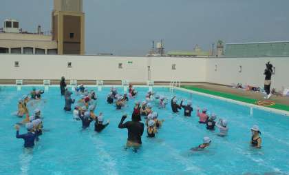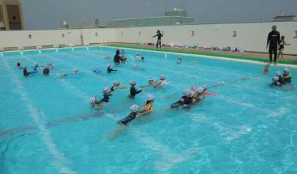 2年生がプール学習で水中サーキットをしました。まず最初に音楽に合わせて水慣れをしました。その後、1年生で経験した水中サーキットをしました。楽しく水遊びができました。