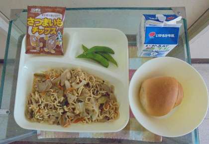 献立は、やきそば、えだまめ、おさつチップス、ミニコッペパン、牛乳です。