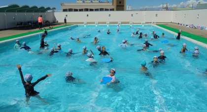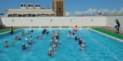 2年生のプール学習は、水慣れをしたあと、浮く、もぐる遊びをしました。最後には自由時間があって、とても楽しく水遊びができました。