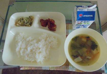 献立は、ヤンニョムチキン、とうふのスープ、切干しだいこんのナムル、ご飯、牛乳です。