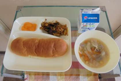 献立は、カレーマカロニグラタン、豚肉と野菜のスープ、みかんの缶詰、おさつパン、牛乳です。
