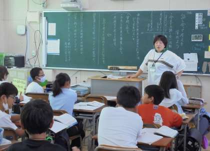 国語は「話し合って考えを深めよう」を学習しました。議題の確認、それぞれの立場の意見を聞く、それぞれの立場から質問するなど、話し合いの進め方を学習しました。6年生の教室の横にある第2音楽室の壁には、修学旅行で調べたことを掲示しています。