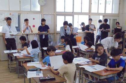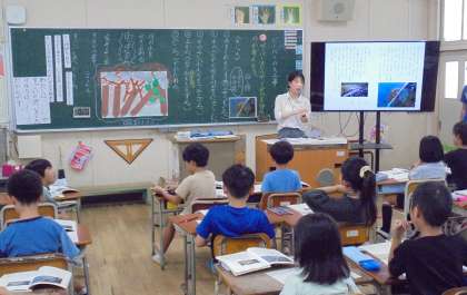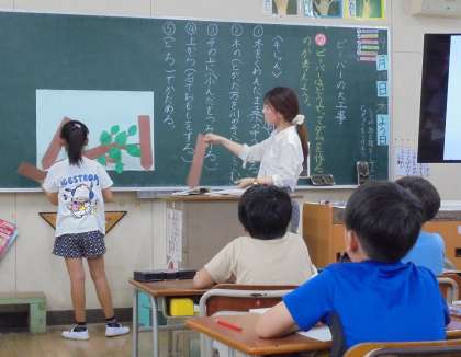 2年生が国語「ビーバーの大工事」を学習しました。今日は校内の授業研究会として国語科の指導法について研修しました。ビーバーがダムを作る順序や様子を大事な言葉を選んでワークシートにまとめました。実感を持たせるために、写真や掲示物、動画を活用しました。