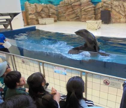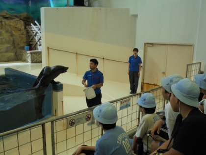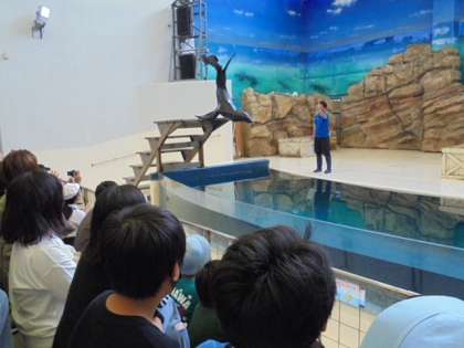 イルカショーを見ました。1番前の先に座った子どもたちには、水しぶきがかかるほど迫力がありました。