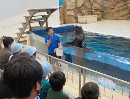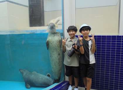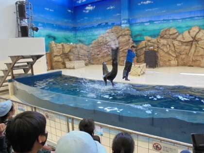イルカショーはとても楽しかったです。イルカのジャンプ力にはびっくりです。最後に、ごまアザラシと並んでハイ、ポーズ。