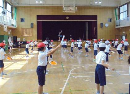 体育館で運動会の団体演技「エイサー」の練習をしました。厚紙で作ったパーランクとバチを使って、「イーヤーサーサー」と威勢の良いかけ声を出し、楽しく踊っています。