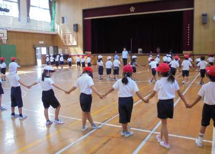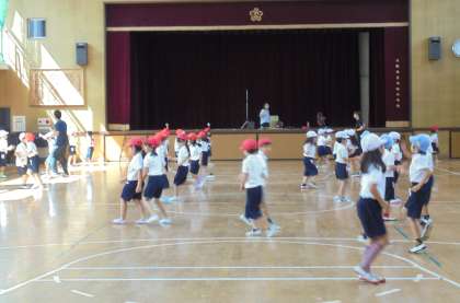 1年生が運動会の団体演技で行うダンスの練習をしました。曲に合わせてリズミカルに足を動かすことができるように、ステップの練習をしました。