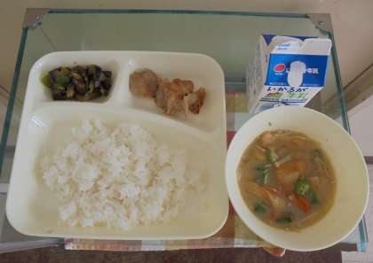 献立は、鶏肉のてり焼き、とうがんのみそ汁、なすのそぼろいため、ご飯、牛乳です。