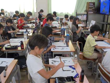 4年生が書写でひらがな「らん」の折れの書き方を学びました。ひらがなの筆使いに気をつけて、毛筆で書きました。