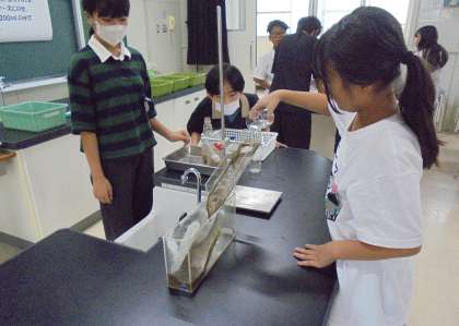 6年生は理科「大地のつくりと変化」を学習しています。今日は、堆積して地層を作る様子をたい積水そうに土と砂と砂利を入れて、水を流して調べました。また、ペットボトルに水と土、砂、土砂を入れて混ぜ合わせて、しばらく置いて様子を観察しました。しばらく置いておくと、粒子が大きいものから順に沈殿して地層のようなものができました。