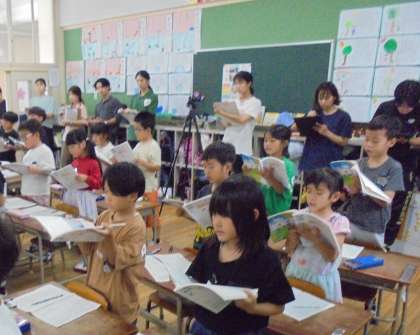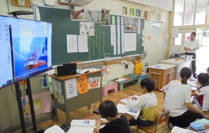 1年1組で国語科授業研究会を行いました。たくさんの先生たちが参観に来て、子どもたちは少し緊張していましたが、集中して学習することができました。「いろいろなふね」で消防艇の役目とつくりを考えながら、文章を読んでワークシートにまとめました。