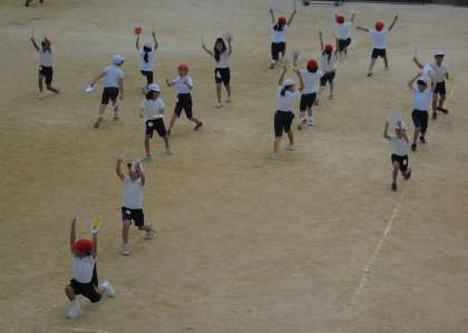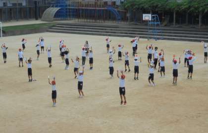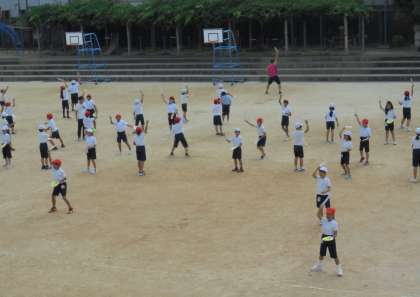 4年生が運動場で運動会の団体演技「エイサー」を練習しました。運動場に響くほどのかけ声を出し、元気に踊りました。退場の振付も練習しました。