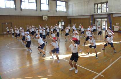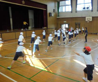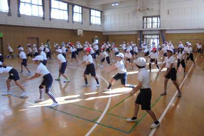 5年生が運動会の団体演技「南中ソーラン」を練習しました。ニシン漁の沖揚げ作業の動作を取り入れた振付で、勇壮に力強く踊れるように練習をしています。
