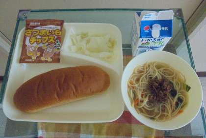 献立は、タンタンめん、キャベツの甘酢づけ、おさつチップス、黒糖パン、牛乳です。