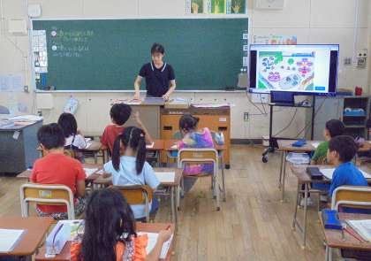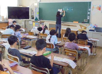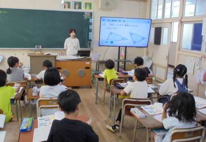 2年生の1時間目です。1組は新出漢字の学習をしました。先生が書く漢字のかき順をしっかりと見て、漢字ドリルで練習しました。2組は算数「かけ算」を学習しました。「1つ分の数」と「いくつ分」の関係の場合にかけ算が用いられることをデジタル教科書を使って学習しています。3組は算数「長方形、正方形、直角三角形について」振り返りをしました。