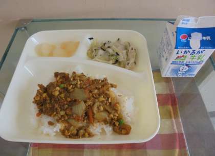 献立は、大豆入りキーマカレーライス、キャベツのひじきドレッシング、和なしの缶詰、ご飯、牛乳です。