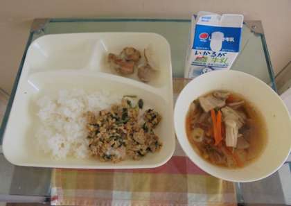 献立は、鶏肉のゆず塩焼き、ソーキ汁、ツナ大豆そぼろ、ご飯、牛乳です。