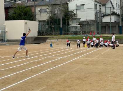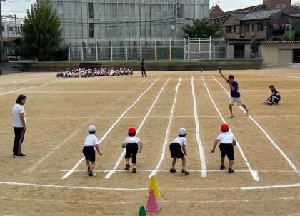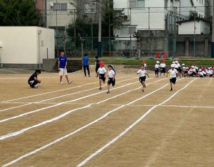 1年生が運動会で行う徒競走の練習をしました。実際にスタートピストルを鳴らして走ってみました。ゴールめざして駆け抜けます。