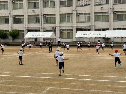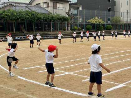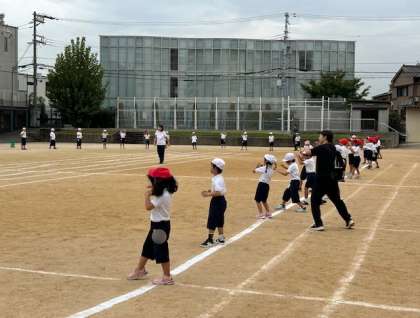 かけっこを練習した後に、団体演技の練習をしました。隊形をしっかりと覚えて、元気よくリズミカルに踊っています。