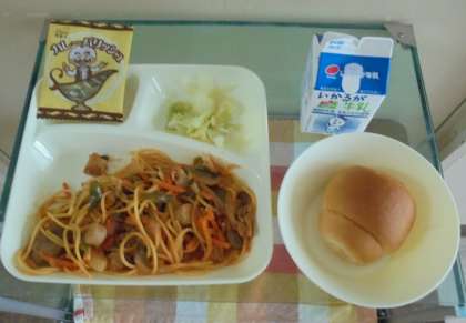 献立は、イタリアンスパゲッティ、サワーキャベツ、カレーフィッシュ、ミニコッペパン、牛乳です。