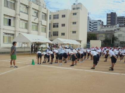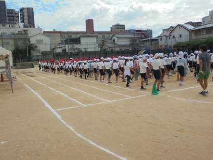 1時間目に全体練習をする予定でしたが、グランドが少しぬかるんでいるので3時間目に変更して実施しました。入場と退場の仕方、開会式、はじめの体操の練習をしました。