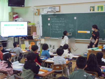 1年生が算数「たしざん」を学習しました。8+3、9+4の計算の仕方をブロックを使って考えました。答えが10より大きい計算ですので、少し難しい学習です。