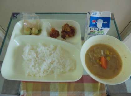 とり天、どさんこ汁、抹茶団子、きな粉、ご飯、牛乳です。