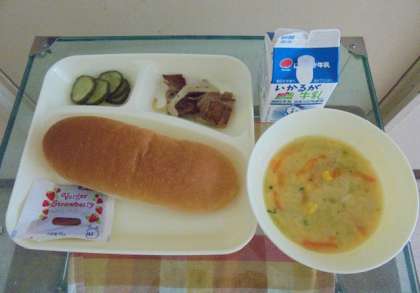 献立は、豚肉のガーリック焼き、コーンスープ、きゅうりのバジル風味サラダ、コッペパン、いちごジャム、牛乳です。