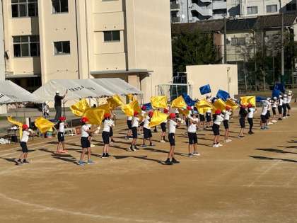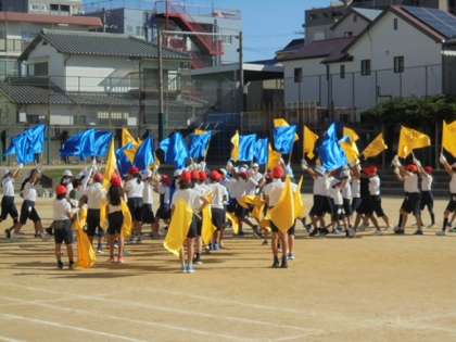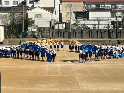 運動会団体演技の練習をしました。隊形移動、フラッグの振り方などひとつひとつ確認をしながら、仕上げていきました。運動会当日は、最高の演技ができると思います。楽しみにしてください。