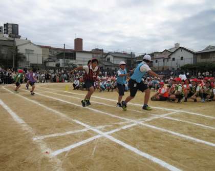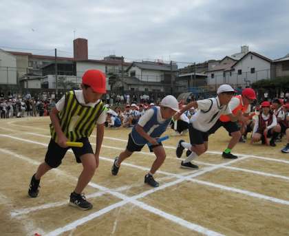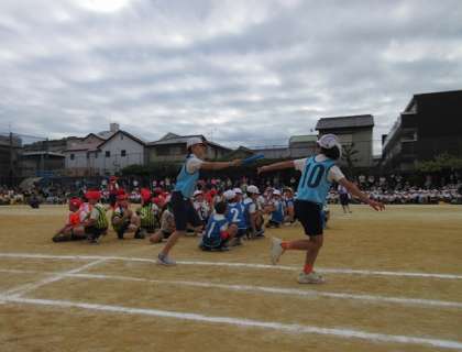 5年生の紅白対抗リレーです。最初は最下位でしたが、後半のものすごい追い上げによって大逆転して1位になったチームもあり、途中で抜かれたり、抜き返したりと見応えのあるレースでした。
