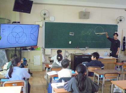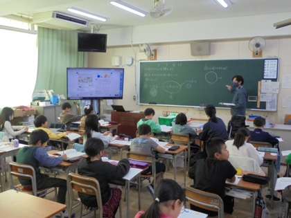 3年生が算数「円と球」の学習をしています。球の特徴を調べたり、コンパスで円の書き方を学んだりしました。慣れるまでコンパスの使い方が難しいようです。