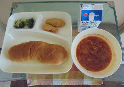 献立は、白身魚のフリッター、ミネストローネ、ブロッコリーのサラダ、おさつパン、牛乳です。