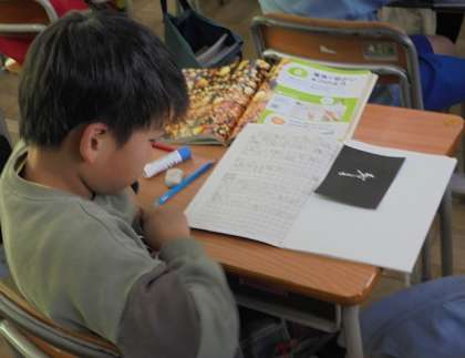 3年生が理科「光のせいしつ」を学習しています。今日は「虫眼鏡で日光を集まるとどうなるか」をしました。黒い画用紙に日光を集めると、画用紙から煙が出て焦げ、穴が開きました。