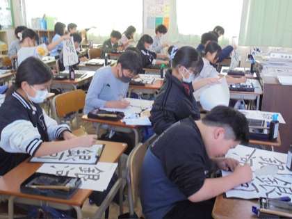 「銀河」という文字を筆で書きました。筆遣いのポイントを意識して、練習しました。集中して取り組んでいました。