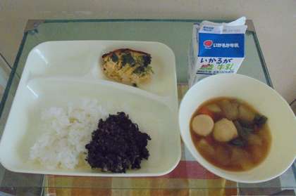 献立は、卵の千草焼き、まる天と野菜の煮もの、のりのつくだ煮、ご飯、牛乳です。